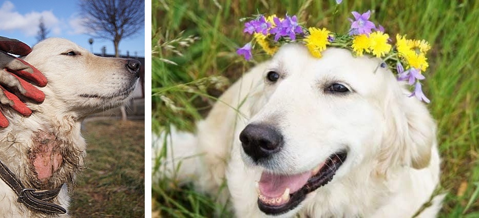Amar nie jest goldenem, ale na pewno zasługiwał na naszą pomoc. Trafił do nas prosto z łańcucha w tragicznym stanie: żył w fatalnych warunkach, miał krowi łańcuch na szyi, nie miał budy, karmiony był suchym chlebem bez wody, miał zaropiałe oczy, z łap sączyła się ropa, był zapchlony.