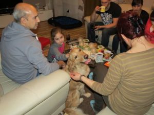 Moja własna goldenka, Wanilka, miała wtedy niecałe pół roku, napięcie i rozładowanie atmosfery zapewniła robiąc obfite siusiu na środku salonu. Na drzwiach lodówki wisiało ogłoszenie, które wykonałam z datą dzisiejszą i podpisem „Emma kommt”. Dalej, przy kanapie było nowe, miękkie legowisko i kilka zabawek. W kuchni był zestaw miseczek i całe zapasy karmy i smaczków. Usiedliśmy wszyscy w salonie, Emma zaczęła powoli witać się z domownikami. Pozytywnie zareagowała na najmłodszą dziewczynkę, dała się miziać Ani i pozostałym córkom, aż w końcu podeszła do Ebiego. Nie zabiegała o jego uwagę. Po prostu usiadła i tak już została do końca naszej wizyty…