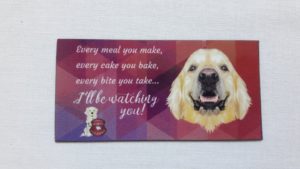 Magnes na lodówkę z napisem: „Every meal you make, every cake you bake, every bite you take… I’ll be watching you!”.