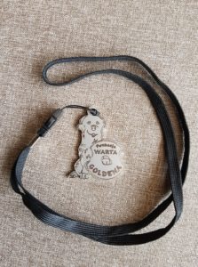 – czyli 2w1 😉 delikatna cienka smycz,a przy niej zawieszony brelok w kształcie logo Fundacji.