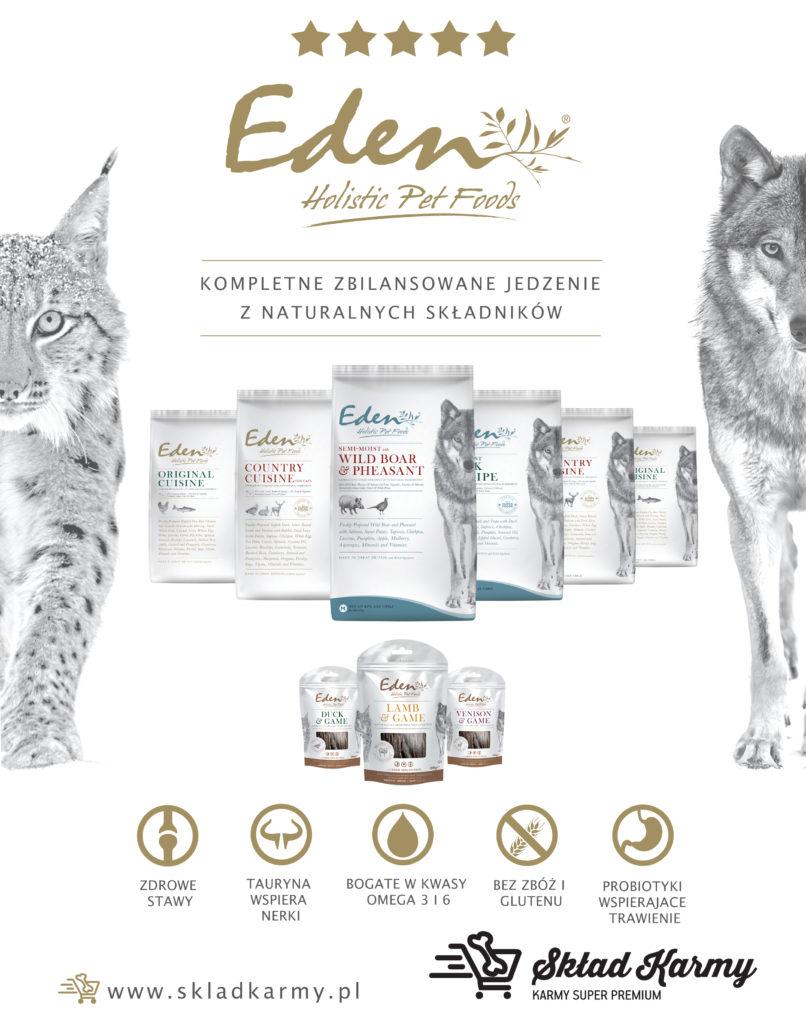 Karmy Eden dla psów i kotów to wynik pracy dietetyków i weterynarzy, którzy są zwolennikami “Diety Ancestralnej”, czyli opartej na naturalnej, holistycznej, pierwotnej diecie przodków. Stworzyli oni najwyższej jakości suche, kompletne pożywienie odzwierciedlające biologicznie zbilansowaną „Dietę Ancestralną”.