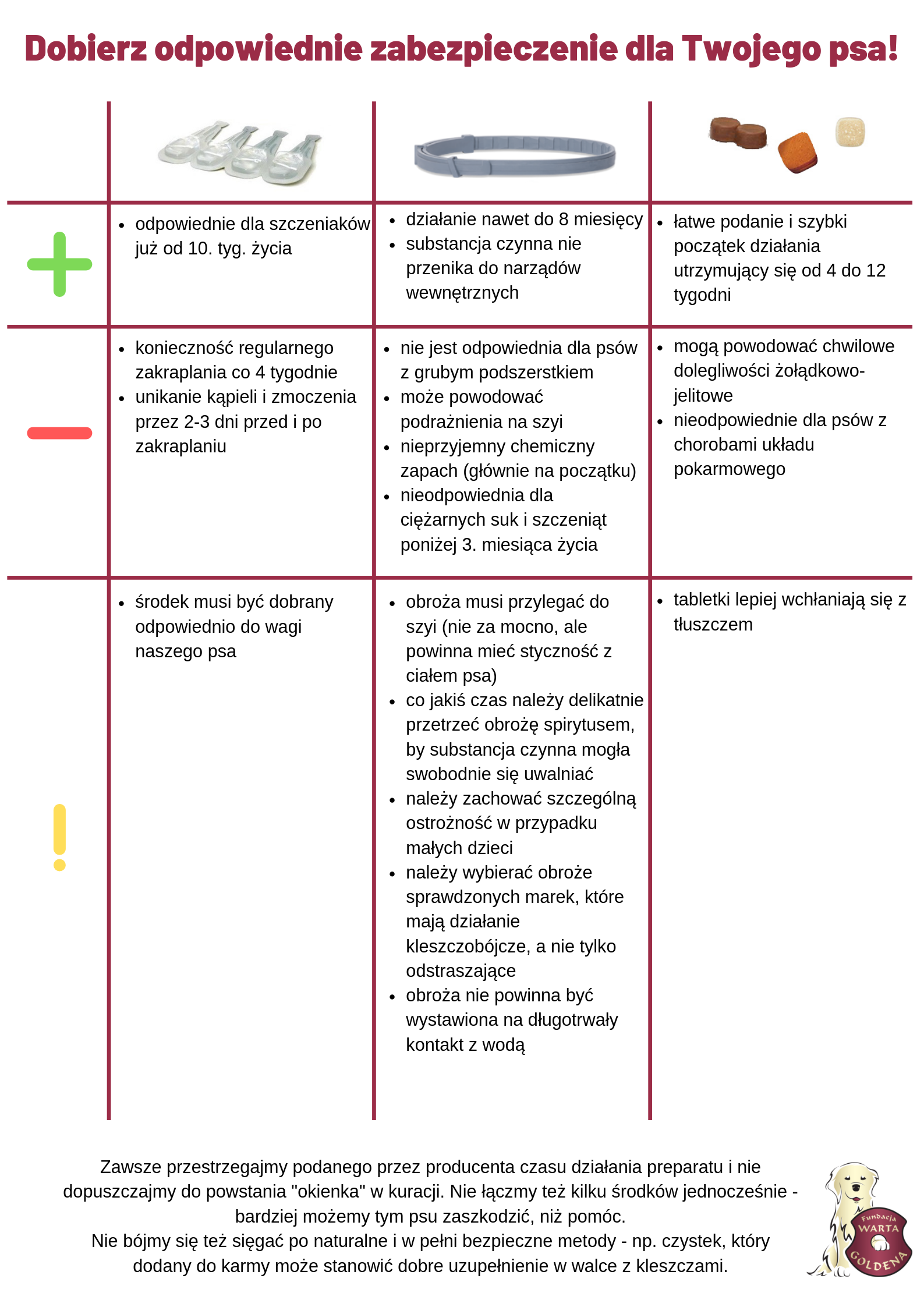 Każda z nich ma swoich przeciwników i zwolenników. Którą wybrać? Która sprawdzi się najlepiej u naszego pupila? To bardzo indywidualna kwestia i środek, który u jednego psa sprawdzi się świetnie, u drugiego może działać gorzej. Poniżej przedstawiamy krótką tabelkę z zestawieniem wspomnianych form ochrony, która może nieco pomóc w podjęciu decyzji.