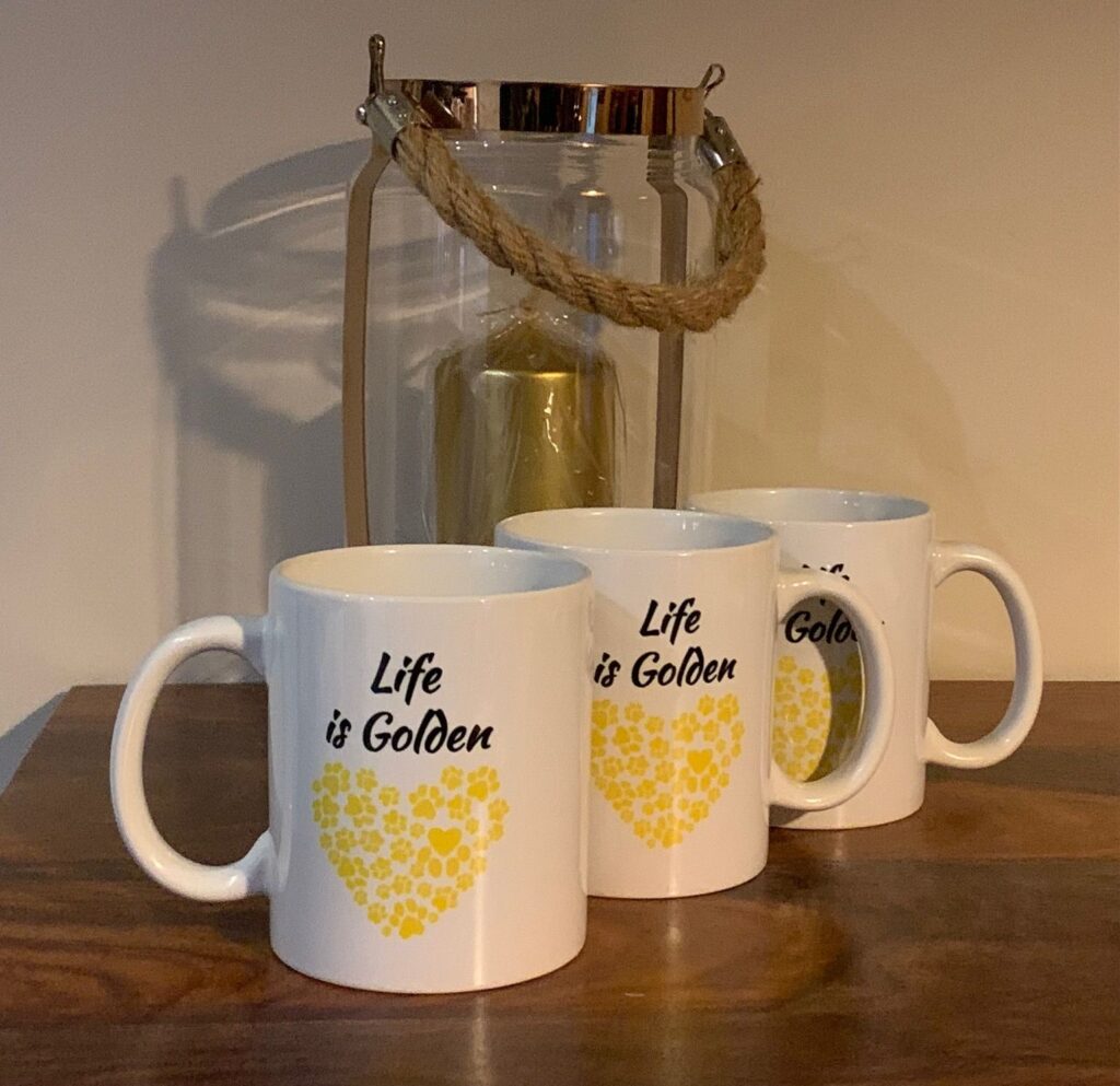 Kubek z napisem „Life is Golden” i żółtym serduszkiem z psich łapek. Pojemność 330 ml.
