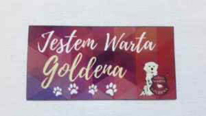 Magnes na lodówkę z napisem: „Jestem Warta Goldena” z logo fundacyjnym.