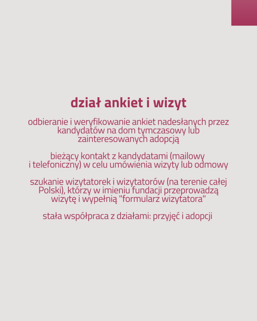 🐾 ANKIET I WIZYT, którego zadaniem jest przyjmowanie ankiet od kandydatów na dom tymczasowy i chcących adoptować psa oraz organizacja wizyt przed/poadopcyjnych.