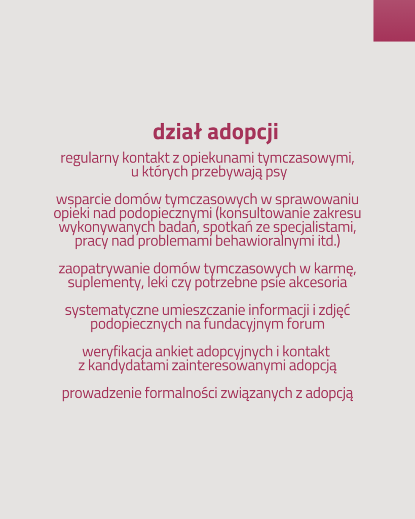 🐾 ADOPCYJNEGO, który czuwa nad procesem adopcyjnym każdego podopiecznego – od umieszczenia psa w domu tymczasowym do podpisania umowy adopcyjnej.