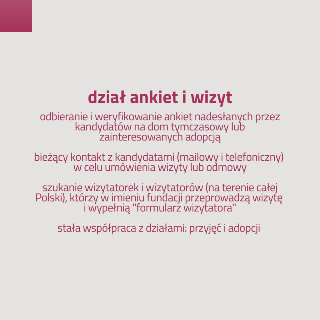 🐾 ANKIET I WIZYT, którego zadaniem jest przyjmowanie ankiet od kandydatów na dom tymczasowy i chcących adoptować psa oraz organizacja wizyt przed/poadopcyjnych.
