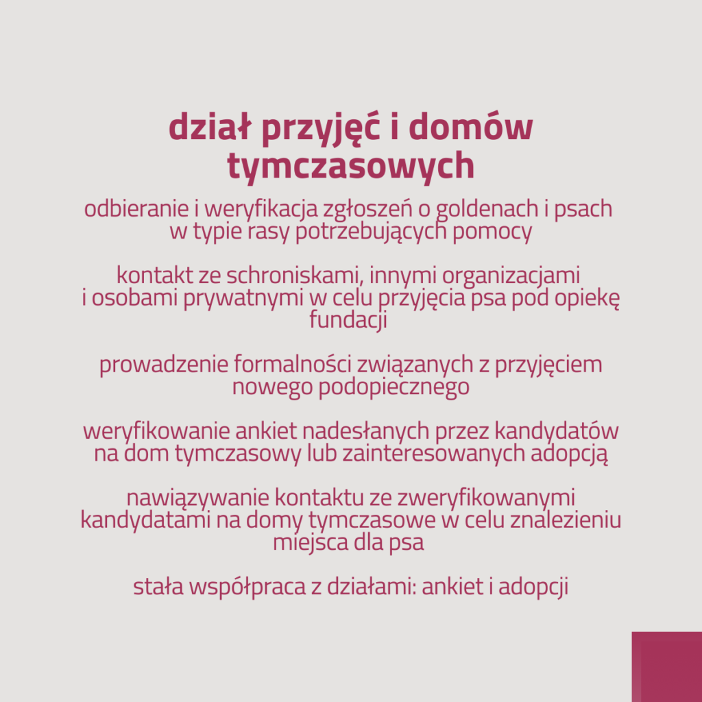 🐾 PRZYJĘĆ I DOMÓW TYMCZASOWYCH, którego zadaniem jest przyjmowanie pod opiekę Fundacji goldenów i psów w typie rasy ze schronisk, od innych organizacji i osób prywatnych oraz nawiązywanie kontaktu ze zweryfikowanymi kandydatami, do których nowy podopieczny może trafić, zanim wybierzemy mu dom stały.