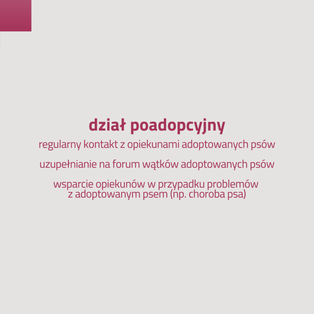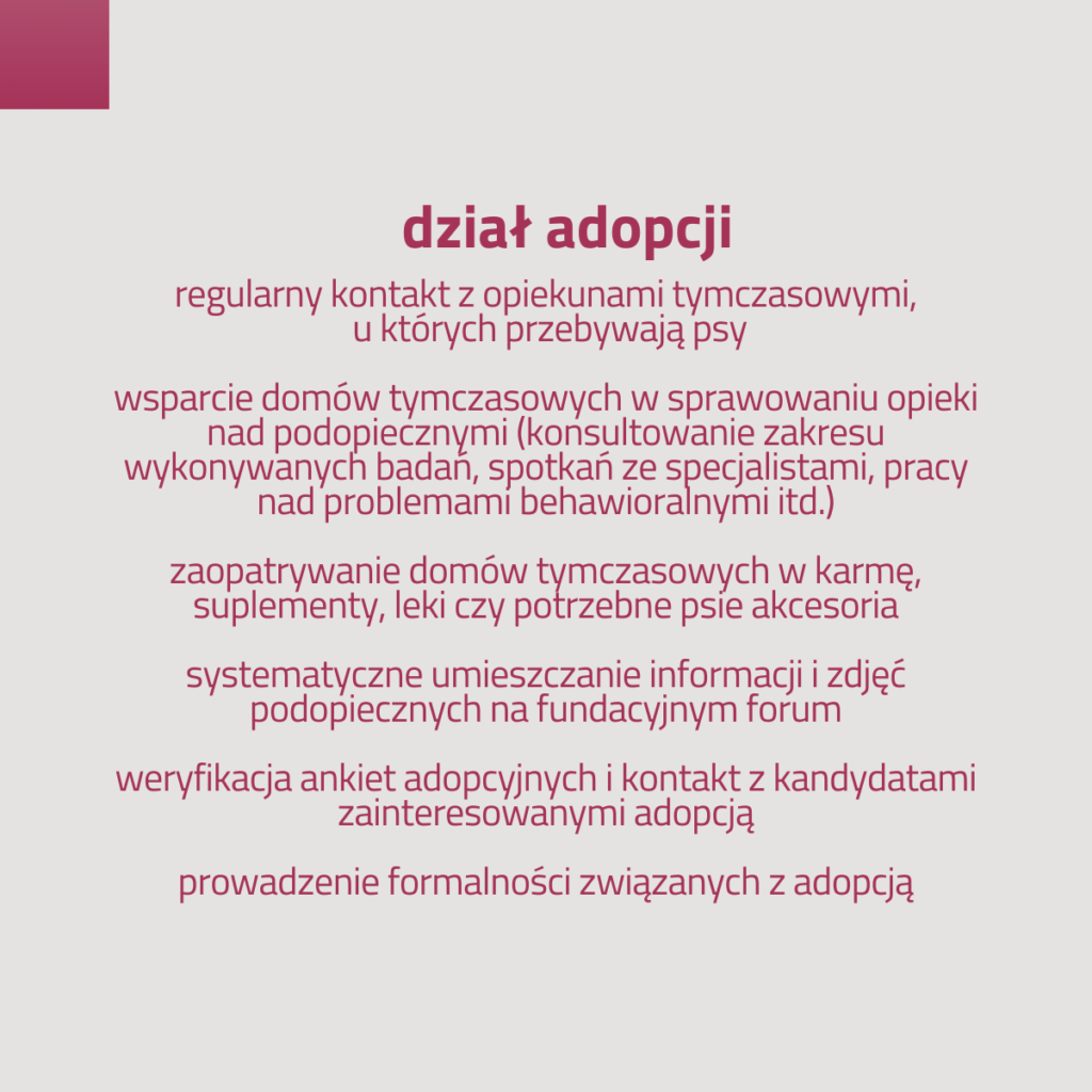 🐾 ADOPCYJNEGO, który czuwa nad procesem adopcyjnym każdego podopiecznego – od umieszczenia psa w domu tymczasowym do podpisania umowy adopcyjnej.