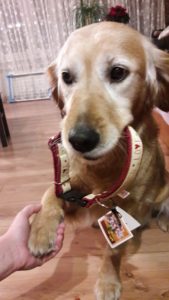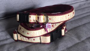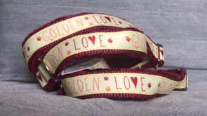 Fundacyjna obroża. Beżowa taśma z napisem GOLDEN LOVE, podszycie z polaru minky w kolorze bordo. Obwód regulowany, zapięcie na plastikowy zatrzask.