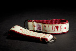 Brelok fundacyjny wykonany z mocnej, bordowej taśmy z logo WG, zakończony metalowym kółeczkiem. Z tej samej taśmy były wykonane nasze pierwsze fundacyjne obroże i smycze – wytrzymałe w każdych warunkach.