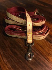Fundacyjna smycz (do kompletu z obrożą). Beżowa taśma z napisem GOLDEN LOVE, podszycie na rączce z polaru minky w kolorze bordo. Długość 2m, przepinana z możliwością zmiany długości smyczy, karabińczyki metalowe.
