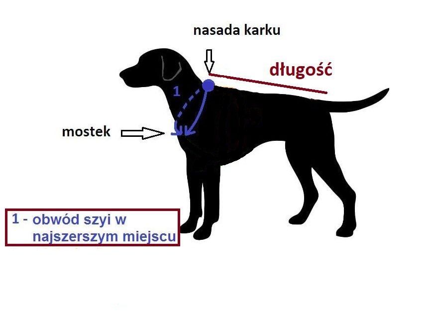 Wymiary (obwód szyi mierzony 5cm poniżej obroży; długość mierzona od szyi do nasady ogona):