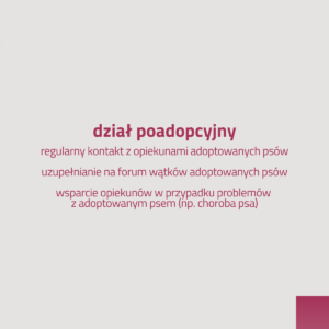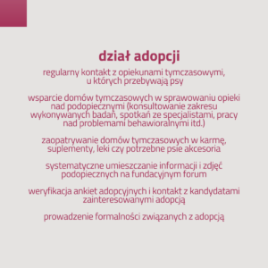 🐾 ADOPCJI, który czuwa nad procesem adopcyjnym każdego podopiecznego – od umieszczenia psa w domu tymczasowym do podpisania umowy adopcyjnej.