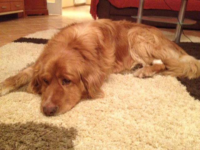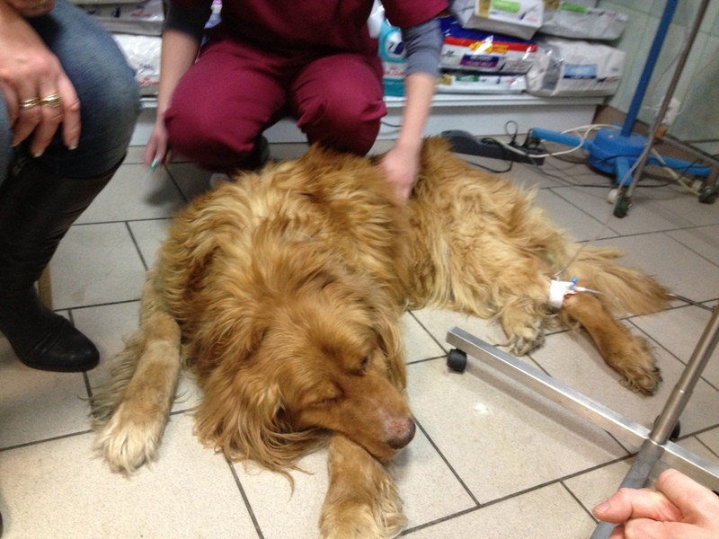 Pies bardzo utracił na zdrowiu,  ledwo kontaktował, chodził zygzakiem, potykał się i przewracał, miewał napady duszenia i ogólnie był w bardzo złym stanie. Dziś dostaliśmy zgodę schroniska na zabranie psa. Pies nie jadł od kilku dni, skrajnie odwodniony, z powiększoną prostatą, wrzodami na dziąsłach i zacewnikowany, gdyż w ogóle sam nie sikał. Leżał dziś biedny od rana na szmatach i robił pod siebie. Zabraliśmy go do weterynarza. W aucie psiak jakby odzyskał zainteresowanie światem, rozglądał się, wstawał, wąchał.