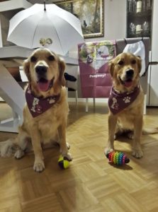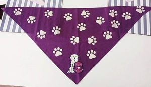 Druga wersja naszej fundacyjnej chusty. Tym razem w kolorze delikatnego fioletu z wzorem w psie łapki i logo WG.