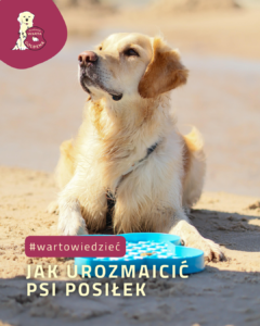 wypełnij tacę do kostek lodu mokrą karmą, pastą lub jogurtem i zamroź; podaj psu zamrożone kostki jako urozmaicenie posiłku.